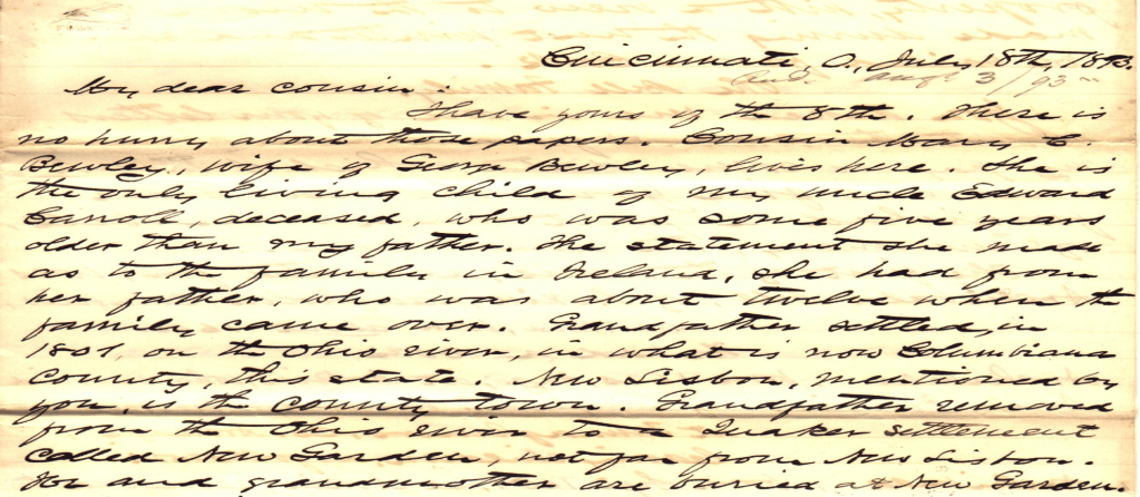 I have yours of the 8th. There is no hurry about those papers. Cousin Mary C Bewley, wife of George Bewley, lives here. She is the only living child of my uncle Edward Carroll, deceased, who was some five years older than my father. The statement she made as to the family in Ireland , she had from her father , who was about twelve when the family came over. Grandfather settled in 1801 , on the Ohio river, in what is now Columbiana County, this state. New Lisbon, mentioned by you is the county town. Grandfather removed from the Ohio river to a Quaker settlement called New Garden, not far from New Lisbon. He and grandmother are buried at New Garden.